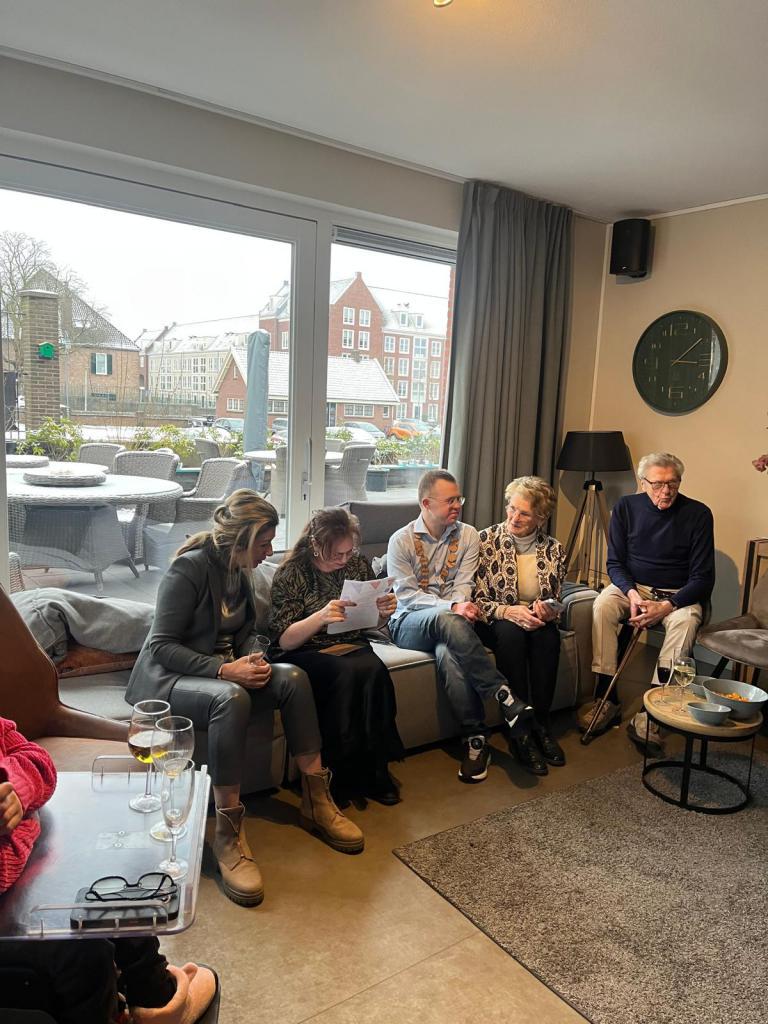 Hanneke Kooiman, lid Raad van Bestuur van ASVZ, tekent samen met bewoners de dienstverleningsovereenkomst. Hanneke had ook een cadeautje meegenomen voor personeel en bewoners. Ze weten nog niet precies wat ze met de waardebon gaan doen maar dat zal zeker goedkomen.